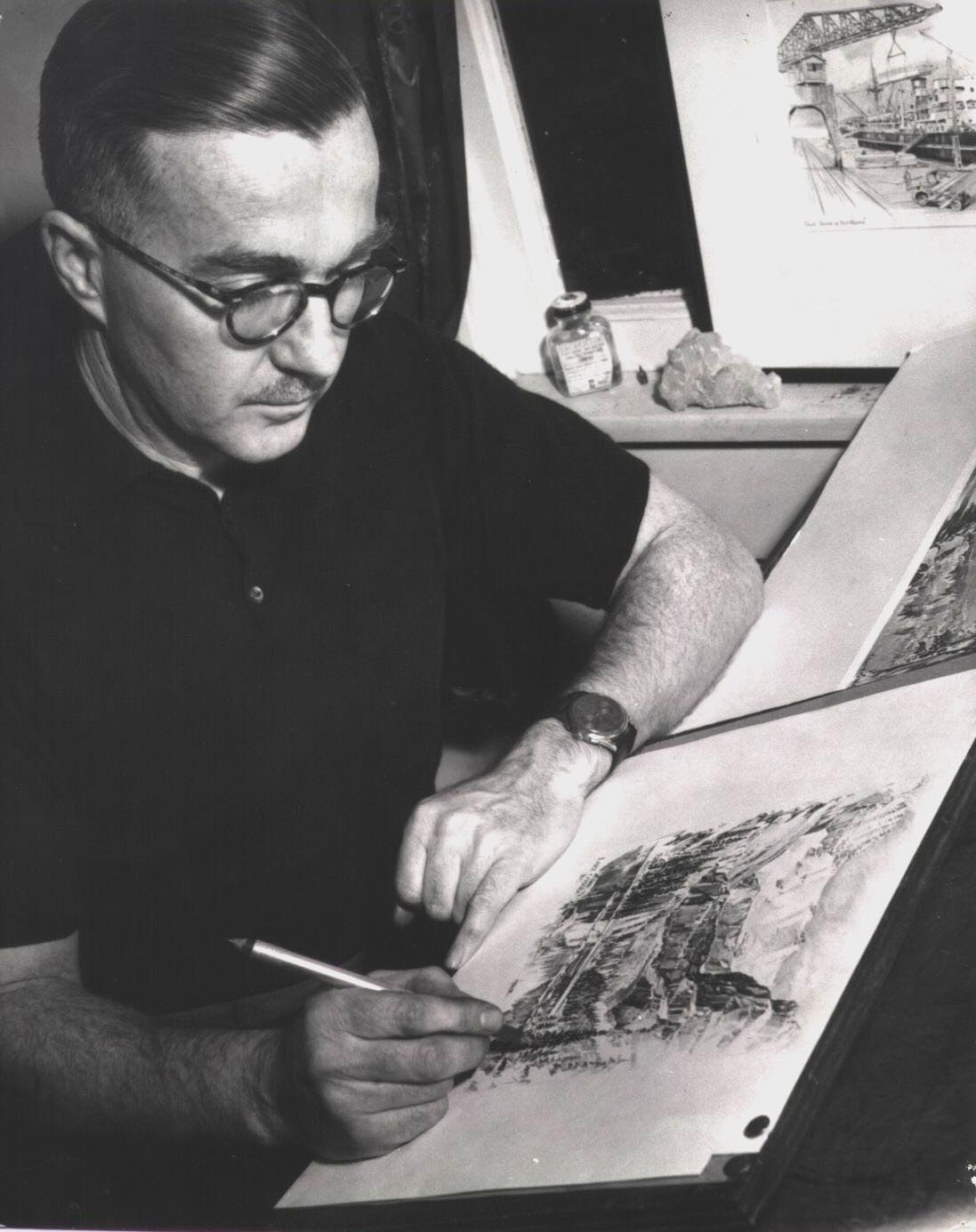 In the mean time he had made contact with the Illustrated London News and they quickly commissioned him in 1955 to prepare a series of drawings on the new Aluminum smelter project at Kitimat. This led to many other drawings for the publication including a series on education facilities in Canada, scenes for British Columbia's centennial celebration in 1958 and the Royal Canadian Navy. He was often invited to join the Navy as a guest during exercises which took him to Hawaii and San Francisco.