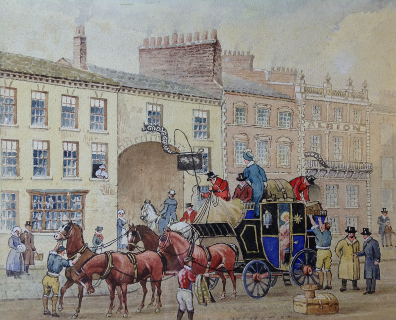Leaving the Bull & Mouth by mailcoach to Harogate. Eliza sitting in the coach, 7 a.m. April 15, 1847 Donated by Jane and Robert Kendall |