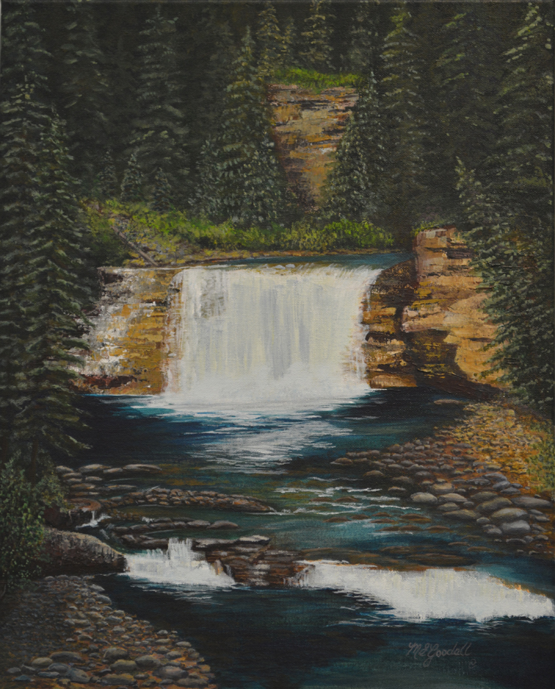 Mary Goodall was born in Olds, Alberta, in 1968. As a child she loved to draw and even when only 4 years old always stayed within the lines in her colouring books. She discovered painting at an early age primarily working in oils. She loved to paint flowers and portraits. She sold her first painting in Grade 9 of a blue jay which she painted in oil. Even at that young age she stepped out of the box of conventional painting and painted the bird on a thin sheet of lacquered pine her father cut for her in his workshop. She used a toothpick to paint the picture. Mary comes from a long line of family Goodall artists dating back to 1794. Her grandfather Edward (Ted) Goodall was her main inspiration. She remembers being at her grandparent’s home on Richmond Road, Victoria, British Columbia, during summer holidays as a child. Her grandfather’s studio was in their home which over looked their garden pathways, raspberry bushes and oak trees. She loved to watch her grandfather draw and paint. You will still see Ted’s water colour paintings in Banff, Jasper, Lake Louise, Vancouver and Victoria. If you look closely at her work you will see a slight resemblance of her grandfather’s hand.