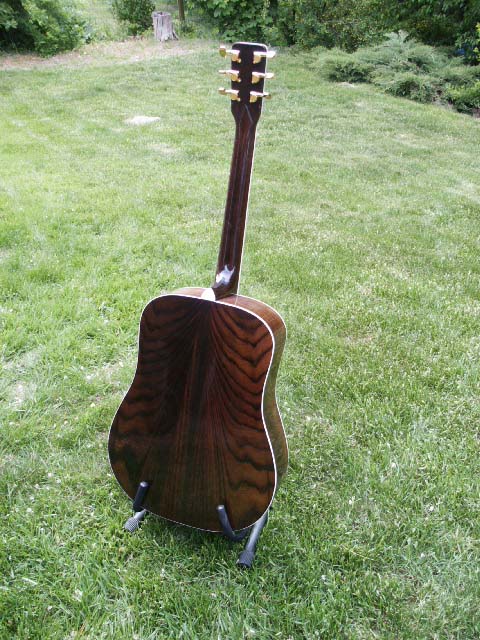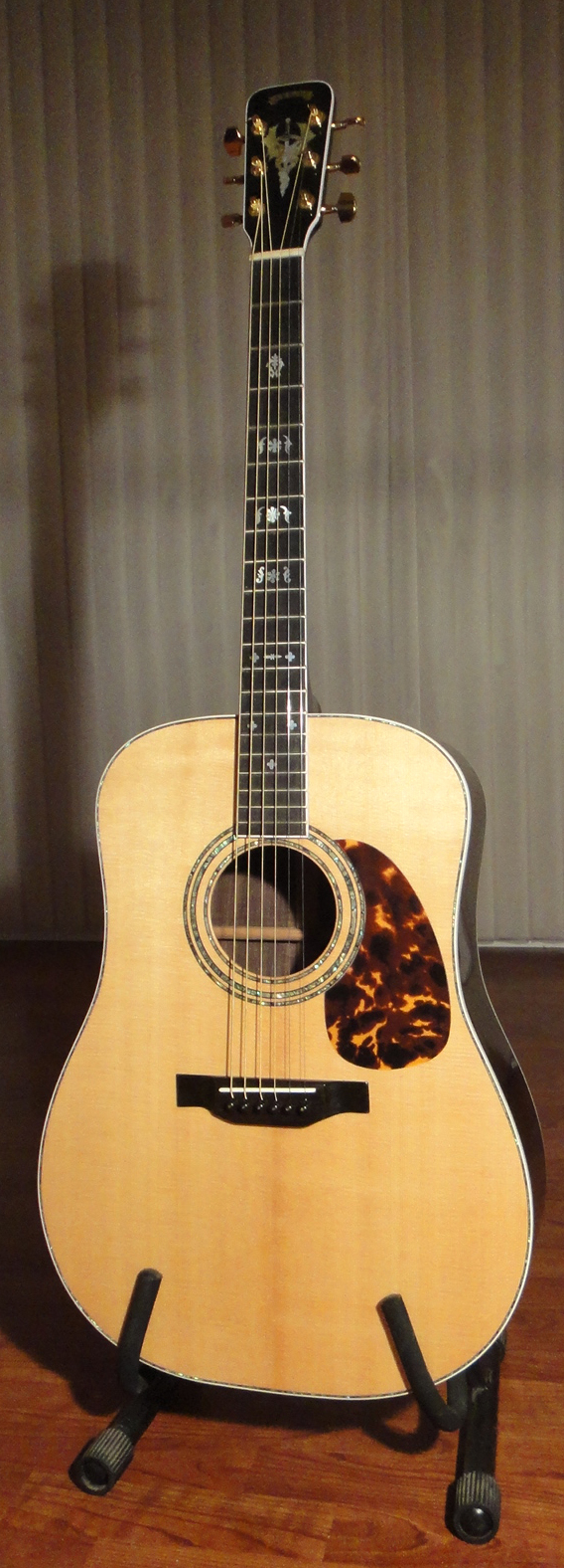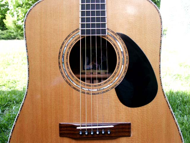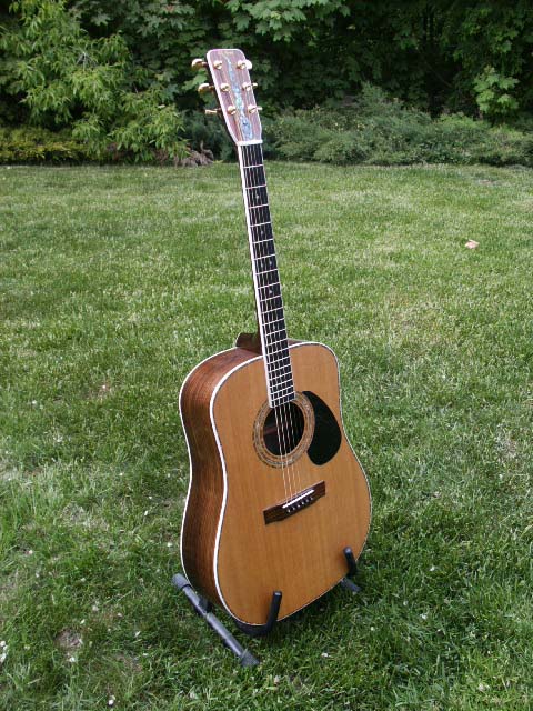 I began building acoustic steel string guitars in 1976. The construction is similar to that used by Martin Guitars during their golden age of construction, with seasoned and very old Sitka spruce for the top, ebony for the fret board, mahogany neck and usually rosewood for the sides and back but have occasionally used other tone woods with considerable success. Custom inlays are either mother of pearl or abalone and the entire instrument is designed to suit the player.