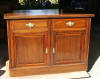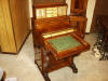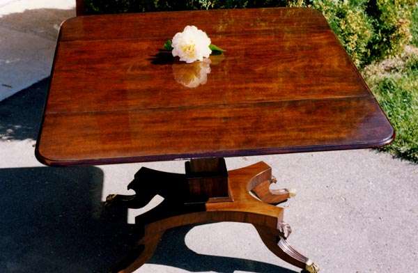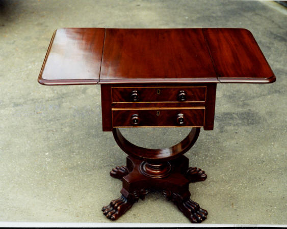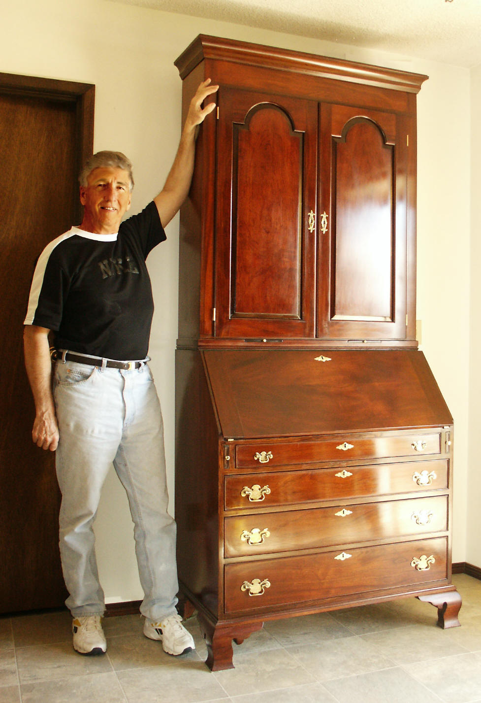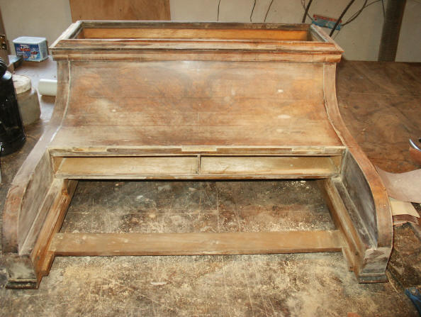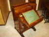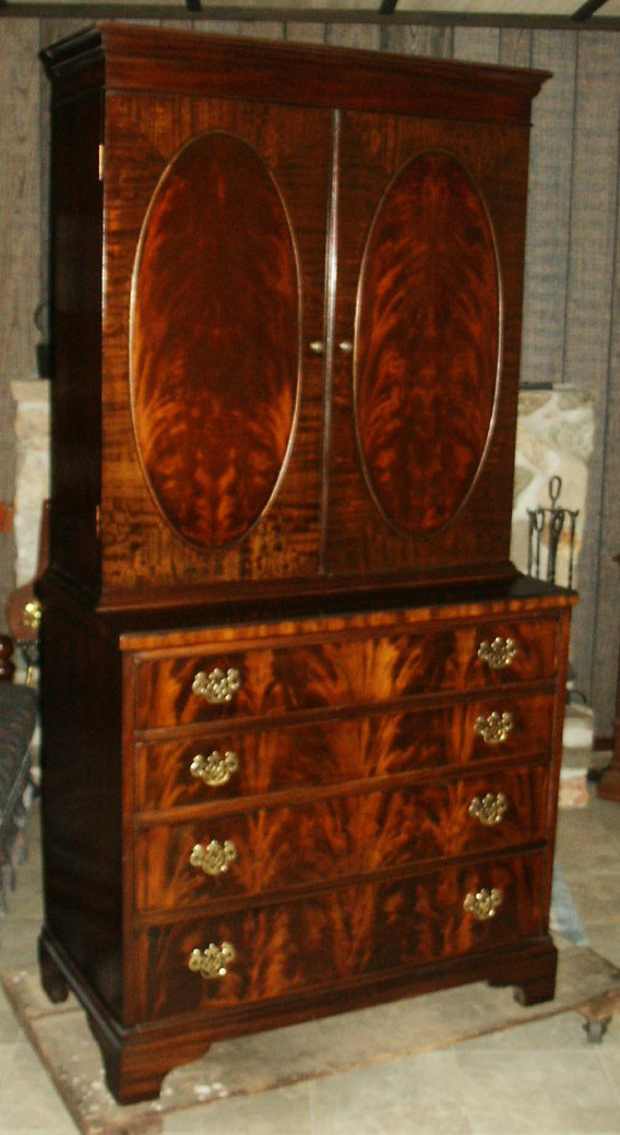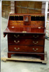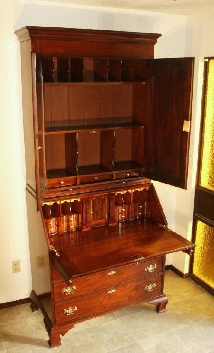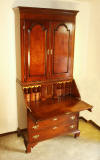 | A 1740s reproduction secretary bookcase was built over a period of two years, completing in 2006. Solid mahogany with rosewood trim are featured, with all timber being cut from large dimensioned stock so that book-matching of the sides, drawers, desk lid and book case doors, could be achieved. The desk has ten secret drawers and compartments which add to the many unique features. All joinery was done in the traditional manner of the 18th century with the final finish being French polish. The design closely follows the work of the Philadelphia craftsmen of the period and only a few modern refinements have been added. These include the hinges for the lid and new reproduction hardware. |