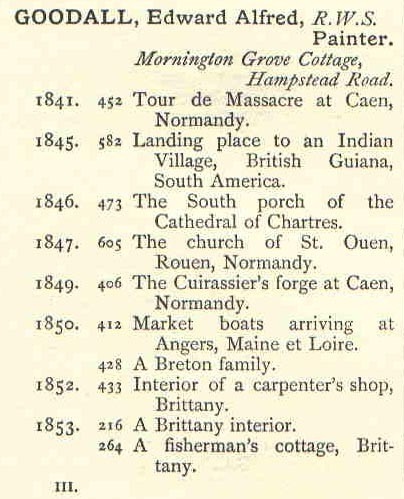 During the period of his apprenticeship, he occupied his spare time making water colour drawings and sketches, one of which may almost be termed the keystone to his whole career. When only seventeen years of age, he made a large drawing of the landing of the Lord Mayor at Blackfriers Bridge in 1836. His father showed it to Clarkson Stanfield R.A.(1793-1867) who at once advised Edward Goodall to let his boy adopt the profession of painting. For this drawing he received the large silver medal at the Society of Arts. He also studied Gothic architecture from Pugin's works and then made a model of a room of the 15th century with furniture and armour complete. This so delighted William Powell Frith R.A. of the Academy, that he offered to paint him a picture for it.