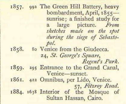 Goodall painted in France, Italy, Spain, Portugal, Morocco, Gibraltar and Venice. He was to return to Venice 15 times to paint as it was his favourite. His residences were Grove Cottage until his marriage to Frances in May of 1858, and then 24 St. George's Square. In 1865 it was 3 Fitzroy Rd. and the St. George's Square house which Edward owned, was his studio. In 1884 they moved to 57 Fitzroy Rd. where they remained. In 1882 he was made a member of the Royal Watercolour Society. He kept busy right up until his death on April 16th, 1908, spending several hours a day painting. Following his death, a studio sale was held by Christies. His sketchbooks, diary of the Guyana expedition and personal letters were donated to the British Library in 2008. Edward Angelo Goodall was buried at Highgate Cemetery.