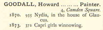 Son of Frederick and Anne Goodall, Howard was educated at the University College School from 1859 to 1864 and attended the Royal Academy as a student in 1868. He had exhibited at the Royal Academy from 1870-1873. Howard was an up and coming painter until his death in Cairo Egypt at the age of 23. Howard had tragically shot and killed his brother Trevelyan accidentally while pistol shooting two years earlier on the island of Capri.