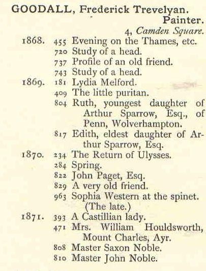 Trev Goodall was the first child born to Frederick Goodall and his wife Anne. He was educated at University College School from 1859 to 1864 and was a student of the Royal Academy beginning in 1865. While there he was awarded two medals - the silver in 1866 and the gold in 1867 and exhibited each year from 1868 to 1871. In 1869 he won the gold medal from the Academy for "The Return of Ulysses."